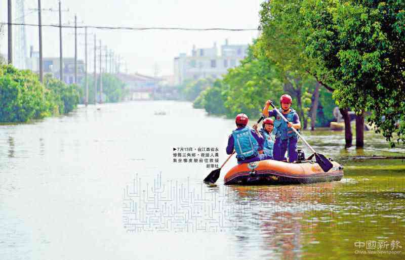 圖:7月13日,在江西省永修縣三角鄉(xiāng),救援人員乘坐橡皮艇前往救援/新華社