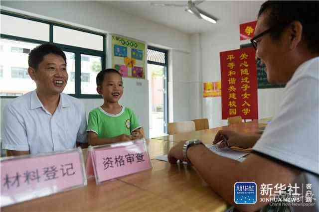 ↑在合肥市和平小學花沖分校報名點,畢權(quán)航和父親畢金倉(左)在辦理報名入學相關(guān)手續(xù)(2017年7月12日攝)。 當日,合肥市瑤海區(qū)進城務(wù)工人員隨遷子女入學報名工作啟動。新華社記者 張端 攝