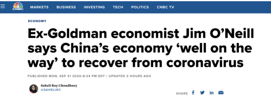 美國(guó)消費(fèi)者新聞與商業(yè)頻道(CNBC)9月21日發(fā)布消息稱,“金磚國(guó)家”概念的首創(chuàng)者、英國(guó)經(jīng)濟(jì)學(xué)家吉姆·奧尼爾認(rèn)為,中國(guó)正順利擺脫新冠疫情引發(fā)的經(jīng)濟(jì)衰退,并將繼續(xù)作為全球國(guó)內(nèi)生產(chǎn)總值(GDP)增長(zhǎng)的重要邊際驅(qū)動(dòng)力。