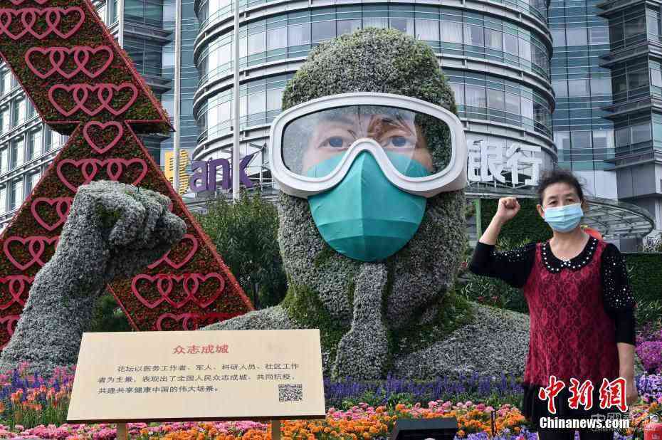 9月26日,市民在北京西單路口西南角《眾志成城》國(guó)慶主題花壇前拍照留念。