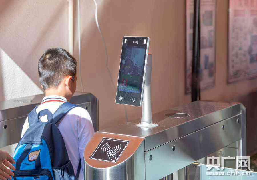在入園處,兩臺(tái)AI人臉識(shí)別安全出入設(shè)備,可以自動(dòng)識(shí)別家長身份(央廣網(wǎng)發(fā) 通訊員供圖)