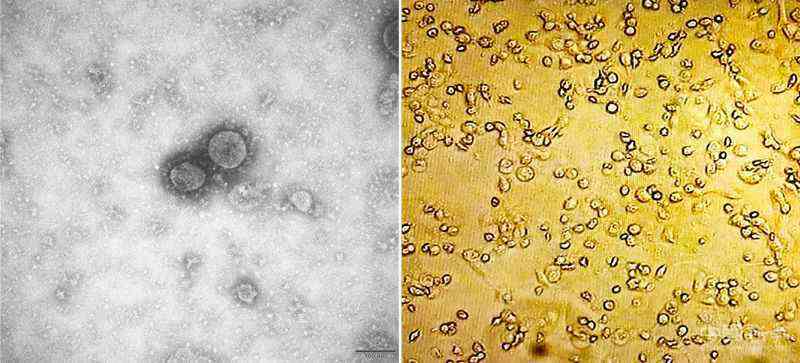 2020年1月7日,我國科研團隊分離到新冠病毒并獲得電鏡照片。新型冠狀病毒屬于β屬的冠狀病毒,病毒顆粒表面分布有“皇冠”樣凸起,能夠與宿主細胞表面的特定受體結(jié)合,穿入細胞內(nèi)部,完成轉(zhuǎn)錄、復(fù)制等生物學(xué)過程,新產(chǎn)生的病毒顆粒從細胞中釋放,再感染其他細胞。左圖是新冠病毒電鏡照片,右圖是新冠病毒復(fù)制導(dǎo)致的細胞病變。 科技部供圖