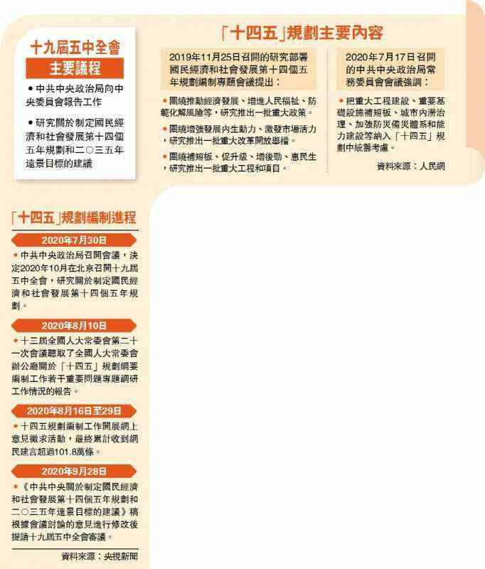 據(jù)中通社、光明網(wǎng)報道,為期4天的中共十九屆五中全會26日在北京開幕,將審議中共中央關于制定國民經(jīng)濟和社會發(fā)展第十四個五年規(guī)劃和二○三五年遠景目標的建議。北京經(jīng)濟學者認為,建議中對中國未來5年經(jīng)濟增速、高質(zhì)量發(fā)展及新型城鎮(zhèn)化發(fā)展的規(guī)劃值得關注。