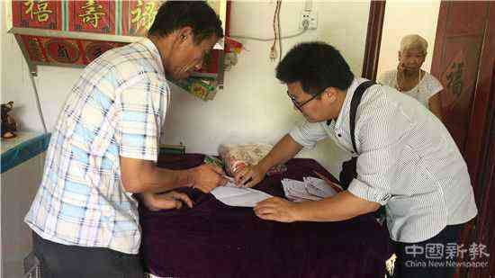 (譚述甫在貧困戶家中發(fā)放扶貧產業(yè)分紅手冊)