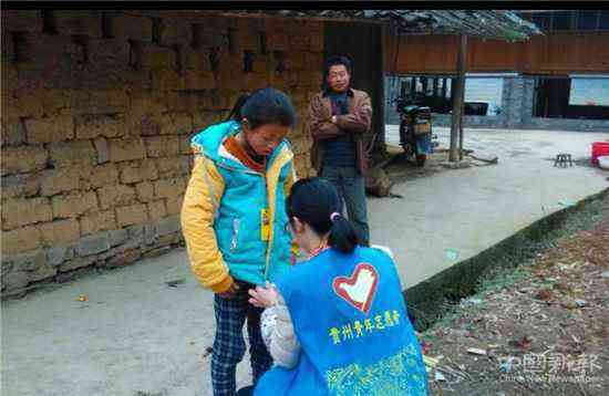 (貴州青年志愿者為小姑娘穿上棉衣)