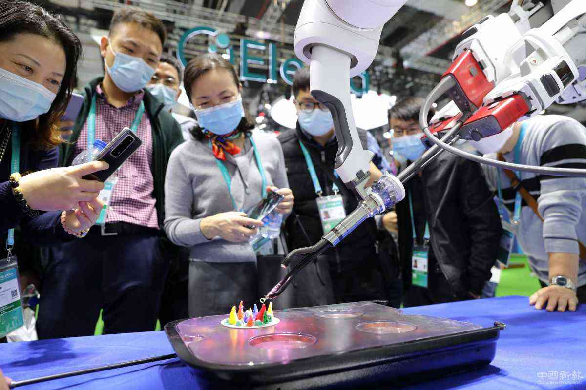 11月6日,在上海進(jìn)博會(huì)服務(wù)貿(mào)易展區(qū),參觀者與“超能機(jī)械手”互動(dòng)。 中國(guó)日?qǐng)?bào)記者 王壯飛 攝