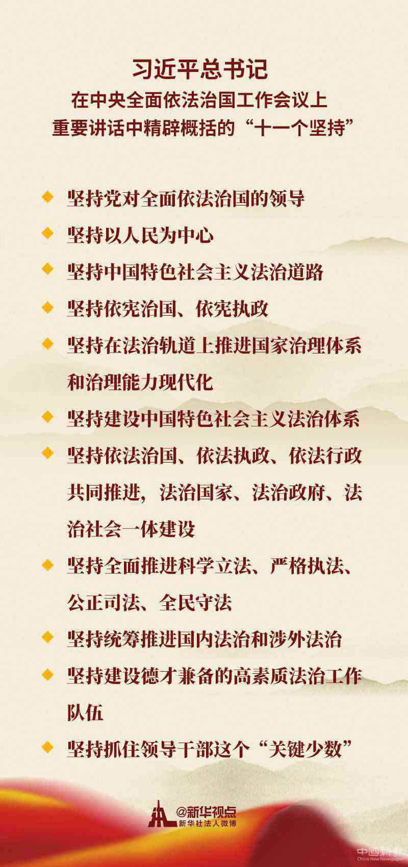 這“十一個(gè)堅(jiān)持”,系統(tǒng)闡述了新時(shí)代全面依法治國(guó)的戰(zhàn)略思想和工作部署,深刻回答了新時(shí)代為什么實(shí)行全面依法治國(guó)、怎樣實(shí)行全面依法治國(guó)等一系列重大問(wèn)題,是新時(shí)代全面依法治國(guó)的根本遵循和行動(dòng)指南。