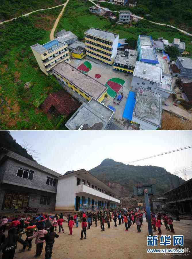 這是一張拼版照片:上圖是廣西大化瑤族自治縣板升鄉(xiāng)弄勇小學(xué)新貌(2017年9月4日攝,無(wú)人機(jī)照片);下圖是改造前的弄勇小學(xué)(2013年12月19日攝)。新華社記者 黃孝邦 攝
