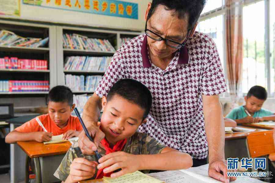 在廣西武宣縣二塘鎮(zhèn)雙桂小學(xué),鄉(xiāng)村教師韋旭禧在糾正學(xué)生握筆姿勢(shì)(6月19日攝)。新華社記者 曹祎銘 攝