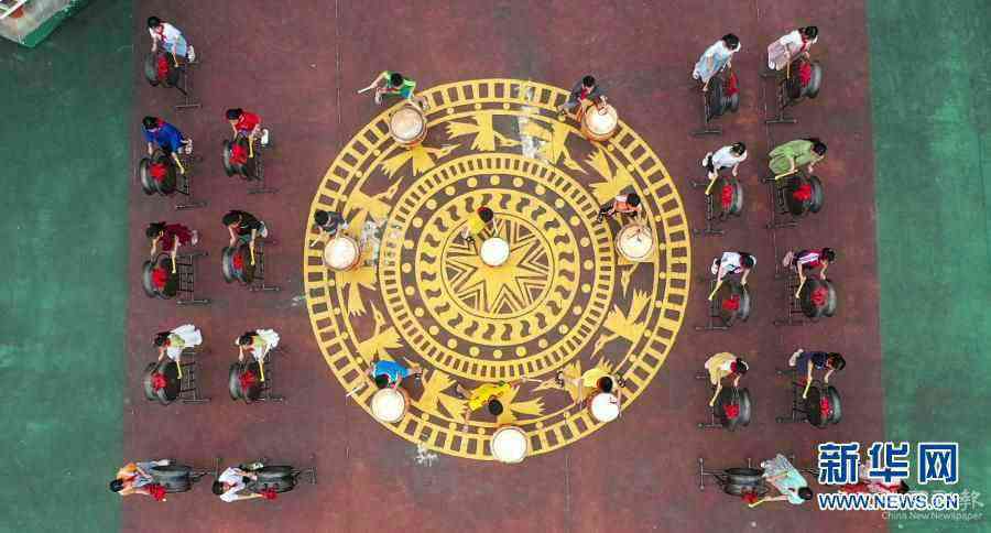 在廣西大化瑤族自治縣六也鄉(xiāng)六也中心小學(xué),來自貧困山村的孩子們?cè)谶M(jìn)行銅鼓合奏排練(9月5日攝,無(wú)人機(jī)照片)。新華社記者 張愛林 攝