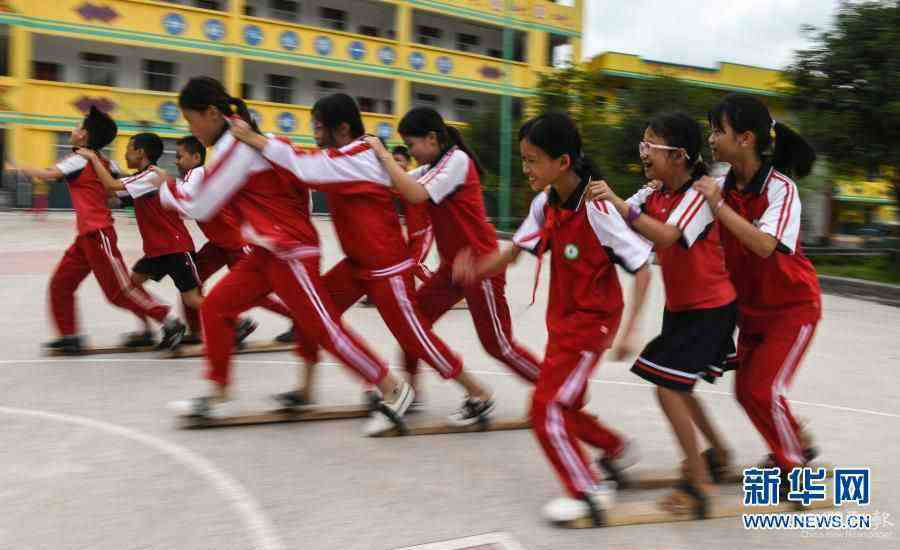 在廣西大化瑤族自治縣六也鄉(xiāng)六也中心小學(xué),來自貧困山村的孩子們?cè)诖笳n間開展三人板鞋競(jìng)速比賽(9月14日攝)。新華社記者 張愛林 攝