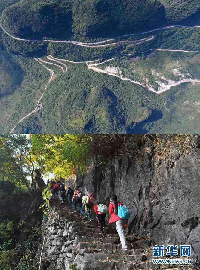 這是一張拼版照片:上圖是廣西大化瑤族自治縣七百弄鄉(xiāng)弄良村通往學(xué)校的水泥路(2019年11月12日攝,無(wú)人機(jī)照片);下圖是弄良村的孩子們爬“天梯”去學(xué)校(2016年12月9日攝)。新華社記者 黃孝邦 攝
