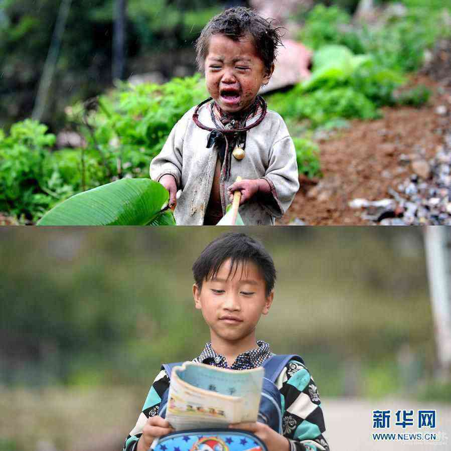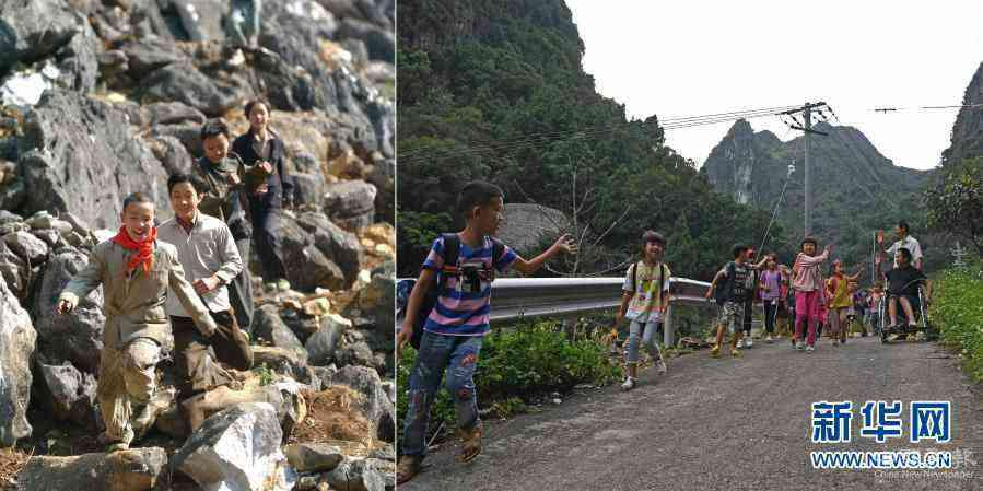 這是一張拼版照片:左圖是廣西百色市凌云縣下甲鎮(zhèn)河洲村念恩小學(xué)的孩子們走山路上學(xué)(2006年1月19日攝);右圖是念恩小學(xué)的孩子們放學(xué)后走水泥路回家(2020年9月8日攝)。新華社記者 周華 攝