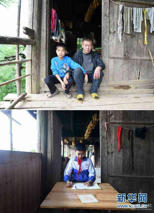 這是一張拼版照片:上圖是在廣西龍勝各族自治縣馬堤鄉(xiāng)東升村,陽(yáng)董超(左)和爺爺坐在家門口(2015年5月5日攝);下圖是在廣西龍勝各族自治縣馬堤鄉(xiāng)東升村,陽(yáng)董超在家門口學(xué)習(xí)(2018年5月10日攝)。曾經(jīng)是貧困村的東升村目前已經(jīng)實(shí)現(xiàn)整村脫貧。新華社記者 陸波岸 攝