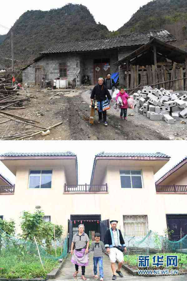 這是一張拼版照片:上圖是黎鳳雪(前右)和家人從廣西南丹縣八圩瑤族鄉(xiāng)吧哈村家里出發(fā),準(zhǔn)備搬往新家(2018年2月4日攝);下圖是黎鳳雪(中)一家從廣西南丹縣八圩瑤族鄉(xiāng)瑤寨移民安置點(diǎn)走出家門(2020年8月6日攝)。新華社記者 周華 攝