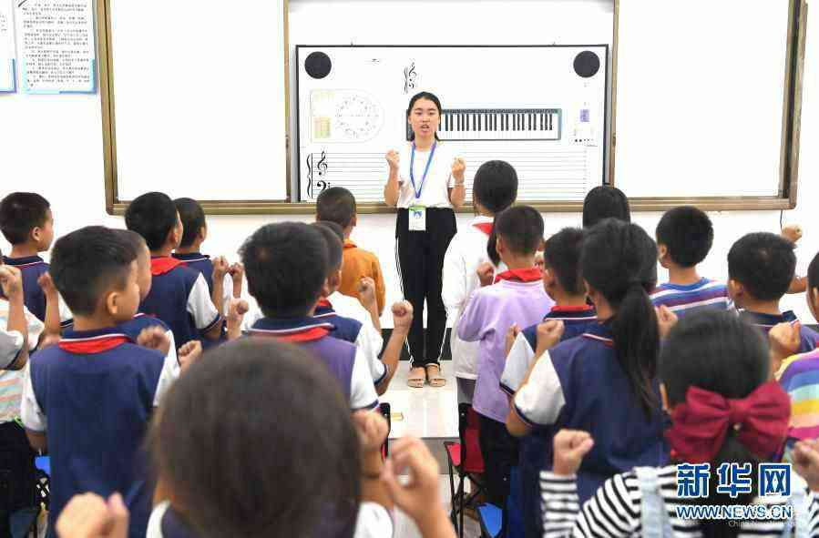 那仙老師在廣西百色市凌云縣泗城鎮(zhèn)后龍村中心小學(xué)多媒體教室教孩子們唱歌(9月8日攝)。新華社記者 周華 攝