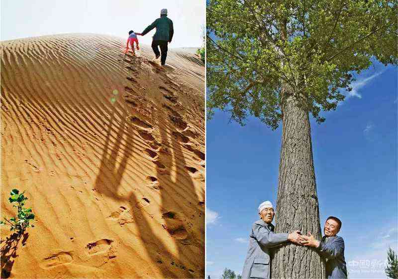 毛烏素沙地是我國四大沙地之一。1984年,陜西省榆林市靖邊縣的郭成旺承包了離家10公里處的荒沙地,帶領全家常年吃住在沙地的簡易房里,數(shù)十年矢志不移防沙治沙,為4.5萬畝沙漠披上了綠裝。左圖:1998年8月,郭成旺老人帶著曾孫行進在沙漠中。右圖:2020年5月22日,99歲的郭成旺老人(左)與孫兒郭建軍抱著當年栽下的第一棵楊樹,向參觀者介紹當年植樹的情景。 新華社記者 陶明/攝