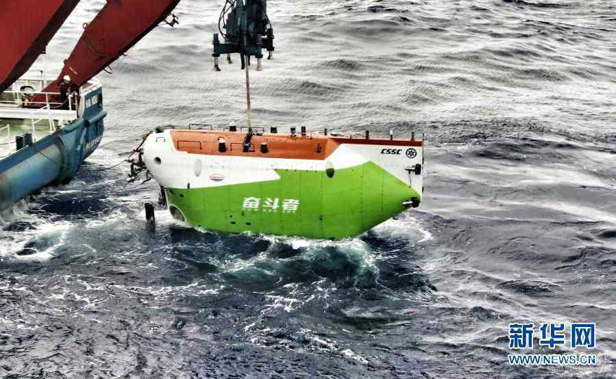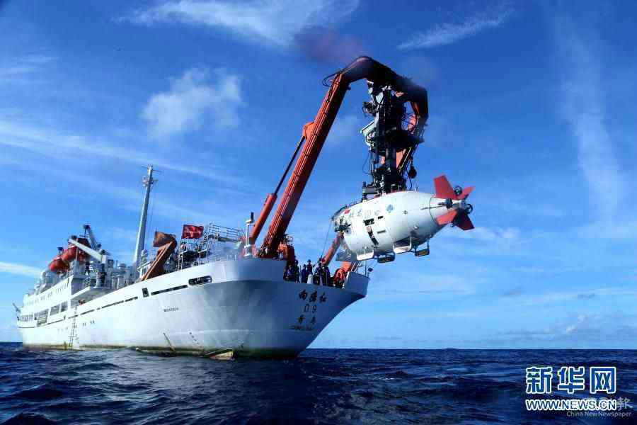 在西太平洋海域,“蛟龍”號載人潛水器離開“向陽紅09”科學(xué)考察船準備進入水中,進行中國大洋38航次最后一潛(2017年6月13日攝)。新華社記者 劉詩平 攝