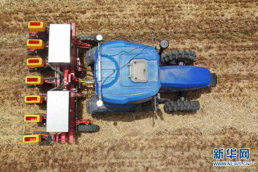 在河南省鄧州市小楊營鎮(zhèn)安眾村,加裝有北斗導(dǎo)航系統(tǒng)的拖拉機在無人駕駛狀態(tài)下播種(2020年5月26日攝,無人機照片)。新華社記者 馮大鵬 攝