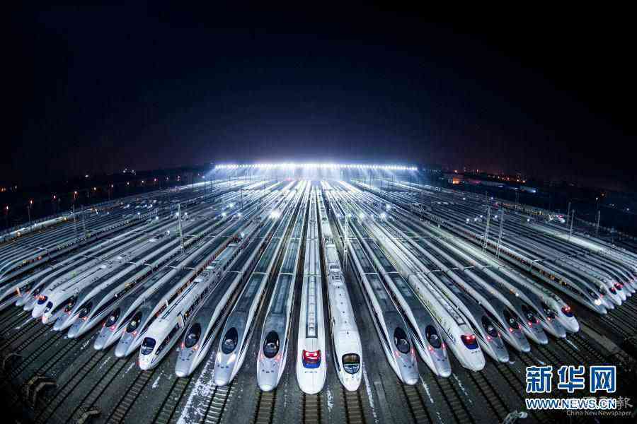 動車組??吭谖錆h動車段的存車線上,準備進行檢修和保溫作業(yè)(2018年2月1日攝)。新華社記者 肖藝九 攝