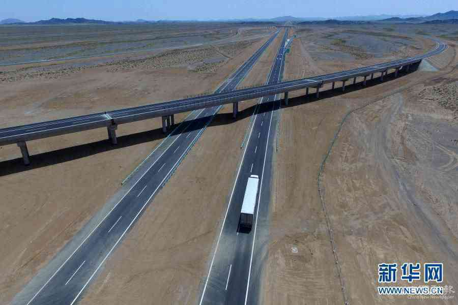 貨車在新疆哈密境內(nèi)的京新高速公路上行駛(2017年7月15日攝,無人機照片)。新華社發(fā)(蔡增樂 攝)