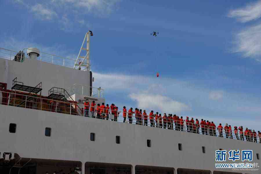 11月28日,在新西蘭南島克賴斯特徹奇市利特爾頓港,新方將贈(zèng)送給中國南極科考隊(duì)的禮物用無人機(jī)投遞到“雪龍2”號(hào)甲板上。