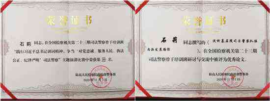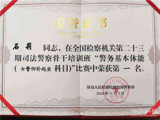 今年10月--11月,石莉同志經(jīng)選派參加了最高人民檢察院警務(wù)部舉辦的“全國檢察機關(guān)第23期司法警察骨干培訓(xùn)班暨法警總隊長集訓(xùn)班”。榮獲警務(wù)基本體能“女警仰臥起坐科目”比賽第一名、“踐行習(xí)近平總書記訓(xùn)詞精神,爭當(dāng)‘對黨忠誠、服務(wù)人民、執(zhí)法公正、紀律嚴明’司法警察”主題演講第三名,撰寫的《淺談基層院司法警察隊伍內(nèi)涵發(fā)展路徑》被評為“優(yōu)秀論文”。此前,在全省檢察機關(guān)第十九期司法警察培訓(xùn)班中撰寫的《長風(fēng)破浪會有時 直掛云帆濟滄?!帆@得一等獎,并被評為“優(yōu)秀學(xué)員”。