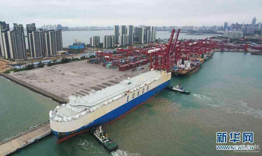 滾裝貨船“勞拉”輪駛?cè)牒?谛阌⒏?,這是海南自貿(mào)區(qū)政策實施以來的首艘汽車外貿(mào)船(2月16日攝,無人機(jī)照片)。新華社記者 楊冠宇 攝