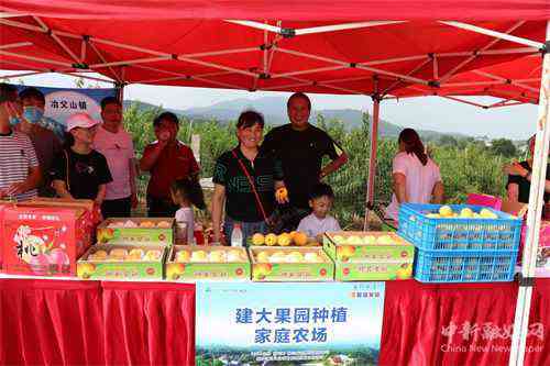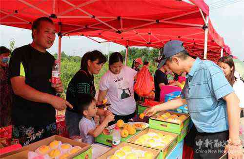 2021年7月24日,在安徽省廬江縣冶父山鎮(zhèn)明圣村舉辦的首屆黃桃采摘文化旅游節(jié)上,游客正在品嘗、購(gòu)買(mǎi)黃桃。