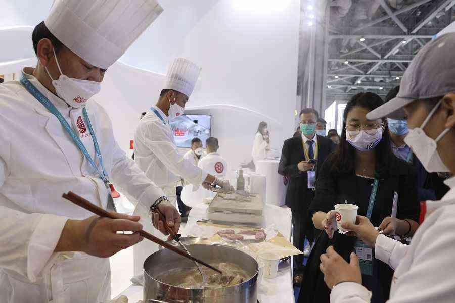 :11月6日,觀眾在食品及農(nóng)產(chǎn)品展區(qū)品嘗美食。(中國(guó)日?qǐng)?bào)記者 馮永斌 攝)