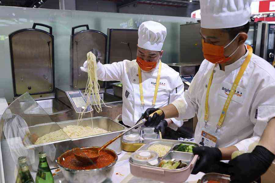 11月6日,參展工作人員在食品及農(nóng)產(chǎn)品展區(qū)烹飪美食。(中國(guó)日?qǐng)?bào)記者 馮永斌 攝)