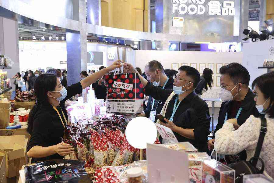 11月6日,觀眾在食品及農(nóng)產(chǎn)品展區(qū)選購(gòu)美食。(中國(guó)日?qǐng)?bào)記者 馮永斌 攝)