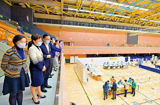 圖:行政長官林鄭月娥到中山紀念公園體育館社區(qū)疫苗接種中心,視察接種復(fù)必泰疫苗的情況,并為中心工作人員打氣。\中新社