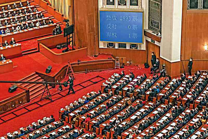 圖:3月11日下午,全國(guó)人民代表大會(huì)高票通過《全國(guó)人民代表大會(huì)關(guān)于完善香港特別行政區(qū)選舉制度的決定》。\美聯(lián)社