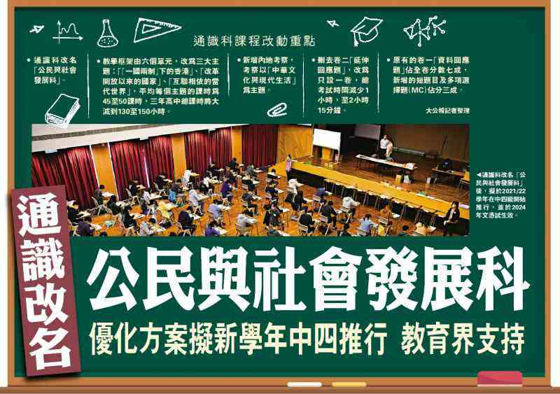新高中通識科改名揭盅,課程發(fā)展議會宣布,學(xué)科將改名為“公民與社會發(fā)展科”。今年2月,教育局曾公布該科目的優(yōu)化方案,除了列出六個(gè)備選名稱,還將原先的六個(gè)單元縮減為三大主題、維持必修必考等。議會昨日表示,期望教育局讓優(yōu)化方案于2021/22學(xué)年在中四級開始推行,會議上亦通過在2021/22學(xué)年中四開始停止開設(shè)組合科學(xué)和綜合科學(xué)科的方案。