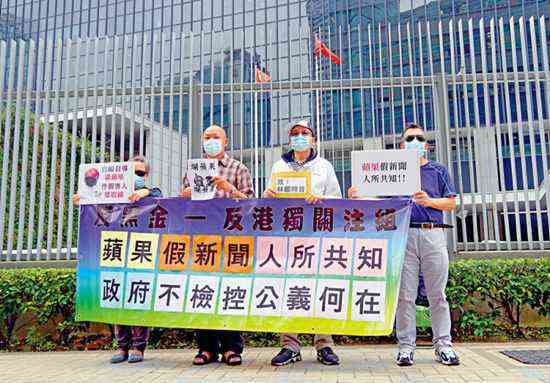 圖:民間團(tuán)體“反黑金反港獨(dú)關(guān)注組”昨日到政府總部抗議《蘋果》制造假新聞,要求政府依法取締。\大公報(bào)記者蕭霖?cái)z