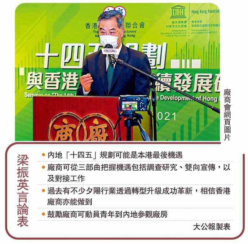 全國政協(xié)副主席梁振英出席有關(guān)國家“十四五”規(guī)劃與香港廠商可持續(xù)發(fā)展的研討會時表示,內(nèi)地“十四五”規(guī)劃可能是本港最后機遇,呼吁港商要把握,建議可從三部曲(包括做好調(diào)查研究、雙向宣傳介紹和對接工作)了解國家的五年規(guī)劃。