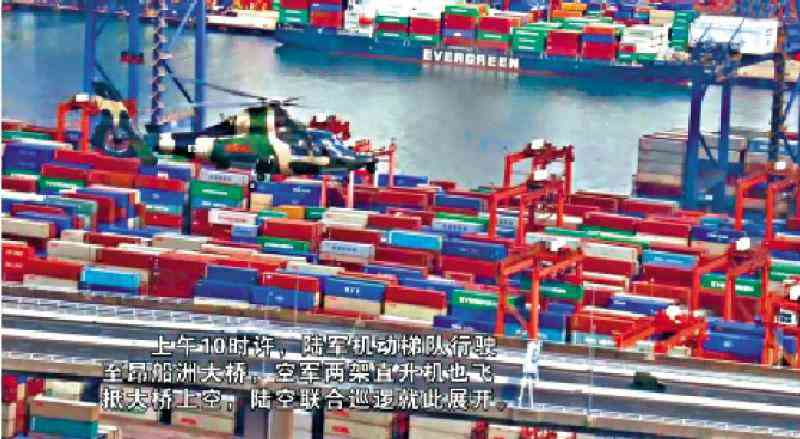 上午10時(shí)許,當(dāng)陸軍機(jī)動(dòng)梯隊(duì)行駛至昂船洲大橋,空軍兩架直升機(jī)也飛抵大橋上空,陸空聯(lián)合巡邏就此展開(kāi)。與此同時(shí),海上聯(lián)合指揮所指揮對(duì)香港海域的“可疑船只”進(jìn)行臨檢拿捕,兩組特戰(zhàn)小隊(duì)搭乘艦艇,在直升機(jī)的引導(dǎo)下到達(dá)任務(wù)區(qū)域?qū)嵤┖I献诽?、攔截查證任務(wù)。