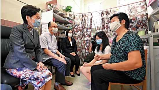 圖:行政長(zhǎng)官林鄭月娥(左一)昨日到由九龍樂善堂營(yíng)運(yùn)的過渡性房屋,探訪其中一戶家庭,了解他們的生活情況。
