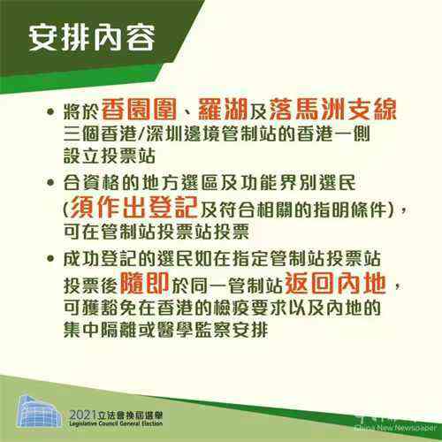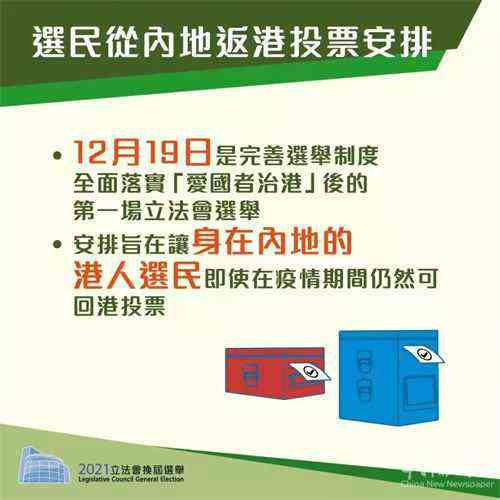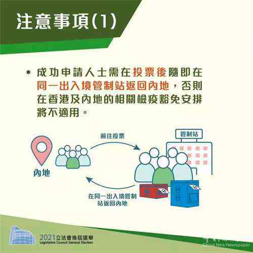 安排適用于任何已登記為2021年立法會(huì)換屆選舉地方選區(qū)及功能界別的選民,而選舉委員會(huì)界別的選民則不適用。如該界別的選民身在內(nèi)地,應(yīng)及早規(guī)劃回港行程或透過(guò)『回港易』計(jì)劃返港以便在投票日進(jìn)行投票。」