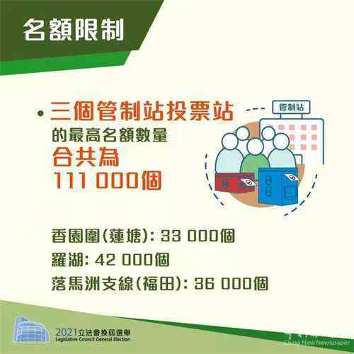 為確保安排實(shí)施有序順暢,安排將采取預(yù)先登記制度并會(huì)設(shè)名額限制,3個(gè)管制站投票站的最高登記名額合共為111 000個(gè)(分別為香園圍(蓮塘):33 000個(gè)、羅湖:42 000個(gè),以及落馬洲支線(福田):36 000個(gè)),而名額將以先到先得形式分配。
