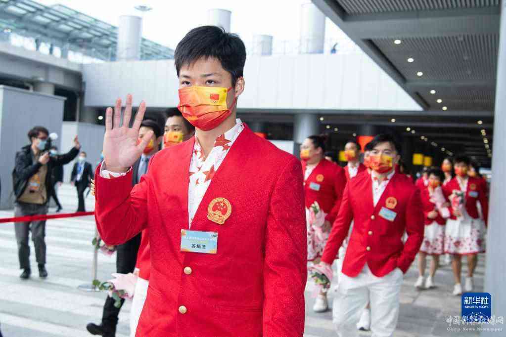 12月19日,內(nèi)地奧運(yùn)健兒代表團(tuán)成員蘇炳添(前)在歡迎儀式上。