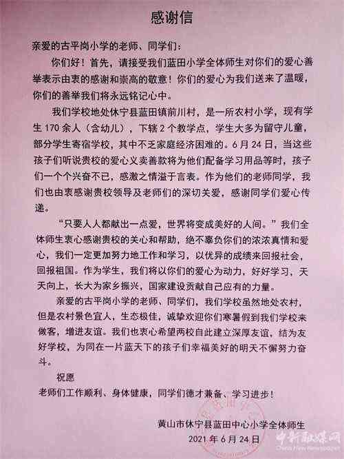 “‘只要人人都獻(xiàn)出一點(diǎn)愛,世界將變成美好的人間’我們?nèi)w師生衷心感謝南京古平崗小學(xué)師生的關(guān)心和幫助,絕不辜負(fù)你們的濃濃真情和愛心,我們一定更加努力地工作和學(xué)習(xí),以優(yōu)異的成績(jī)來回報(bào)社會(huì),回報(bào)祖國(guó)。作為學(xué)生,我們將以你們的愛心為動(dòng)力,好好學(xué)習(xí),天天向上,長(zhǎng)大為家鄉(xiāng)振興,國(guó)家建設(shè)貢獻(xiàn)自己應(yīng)有的力量。也衷心希望兩校自此建立深厚友誼,結(jié)為友好學(xué)校,為同在一片藍(lán)天下的孩子們幸福美好的明天不懈努力奮斗。”該校在給南京古平崗小學(xué)的感謝信中寫道。(王秀娟 程亮)