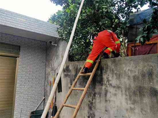 接到村民電話后,劉勝、陳勝強(qiáng)等立即組織隊(duì)員出勤,自帶工具和設(shè)備趕往村民家中。到達(dá)出事地點(diǎn)后,他們在村民的引導(dǎo)下,經(jīng)過仔細(xì)察看,決定采取人工摘除的方法進(jìn)行。隊(duì)員穿好防護(hù)服,搭好梯子爬上去,但又不敢有大動(dòng)作,隨便一點(diǎn)小動(dòng)作就驚動(dòng)了馬蜂,馬蜂飛出來又怕傷了其他的人,只好慢慢地等,馬蜂進(jìn)到窩里后,隊(duì)員輕輕撥開樹葉,小心翼翼地用袋子將馬蜂窩牢牢套住,然后成功摘除,沒有讓一個(gè)馬蜂跑掉。救援隊(duì)解除了村民的后顧之憂,村民給了隊(duì)員一個(gè)大大的“贊”。