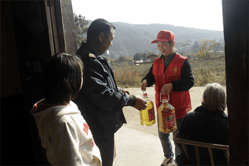 我來幫志愿者協(xié)會志愿者將愛心物資交到貧困村民手中