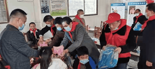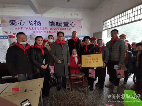 湘鄉(xiāng)市我來幫志愿者協(xié)會負責(zé)人和領(lǐng)導(dǎo)們一起將愛心物資捐給孩子們