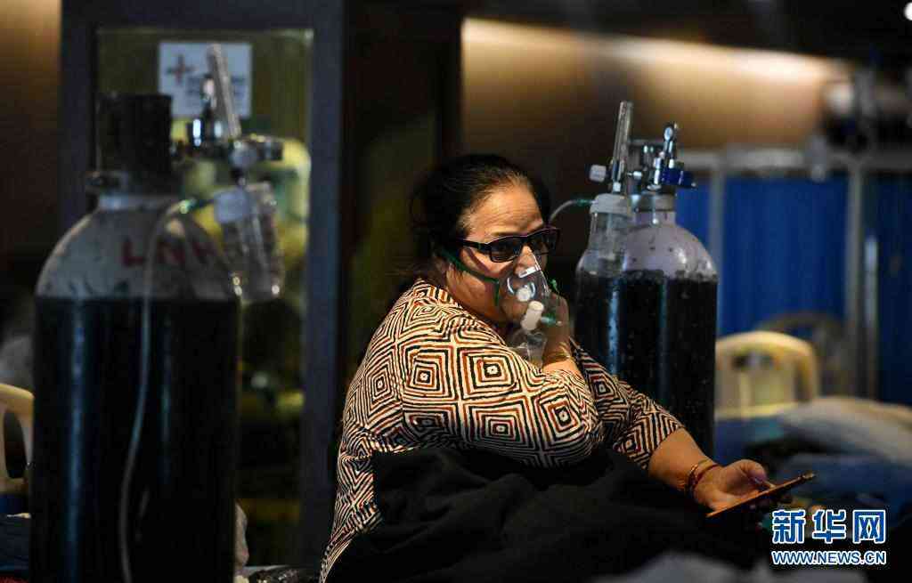 5月8日,新冠患者在印度新德里的一處隔離中心吸氧。