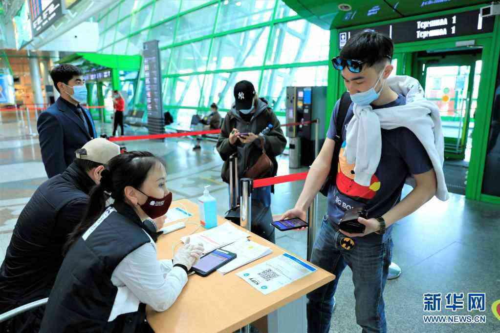 5月13日,在位于哈薩克斯坦首都努爾蘇丹的納扎爾巴耶夫機(jī)場(chǎng),市民掃描健康碼識(shí)別健康狀況。