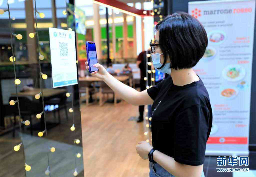 5月13日,哈薩克斯坦首都努爾蘇丹市民在一家餐廳門口掃描健康碼識(shí)別健康狀況。