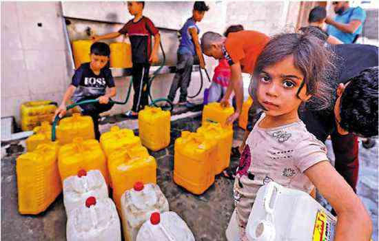 圖:巴勒斯坦兒童20日在加沙取水。\法新社